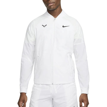 Layer up your look with the Nike Men's Rafa Dri-Fit Court Jacket. This full-zip jacket is designed with perforations at high-heat areas such as the back and underarms for improved airflow to better regular temperatures. Elastic at the cuffs and hem hold the fit in place throughout your activities, plus the stretchy woven fabrics let you move around with ease. Stay dry and comfortable on the court and off with the help of Nike's signature Dri-Fit technology.