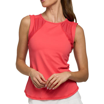 Introducing the LIJA Women's Elite Power Court Tank Cayenne. This flattering tank features cap sleeves, a crew neck and a curved hem for a bit of extra coverage. To keep you cool as your workout heats up, the tank also incorporates fashion-forward ventilating mesh panels on the upper chest and back. Equipped with moisture-wicking technology for quick drying, stretch properties for optimum flexibility, and UPF protection against the sun's harmful UV rays, this top is ideal for both practice sessions and match days alike! Pair it with the Lija Women's Deuce Court Skort for a winning outfit!