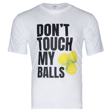 Claim the court with the Court Express Unisex Don't Touch My Balls Unisex T-Shirt at Court Express! This funny top is white and features a bold print graphic that says "Don't touch my balls," with three graphic and bright Court balls to the right. This short sleeve shirt has a crewneck and it has moisture-wicking materials to help you stay cool while playing Court! Read more about our Court Express products on our blog!