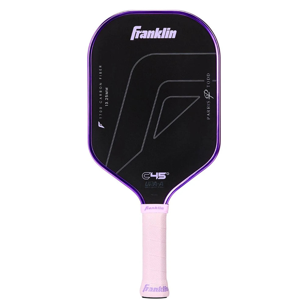 Turn up the heat with the Franklin Parris Todd C45 13.25mm Pickleball Paddle. It features a slim, maneuverable profile that packs a punch with the help of the Powerflex core. The paddle shape combines elements Franklin's Hybrid and Dynasty designed by Parris Todd to get the high-power benefits of an elongated paddle with a more aerodynamic design. Get maximum spin with the help of the T700 carb...