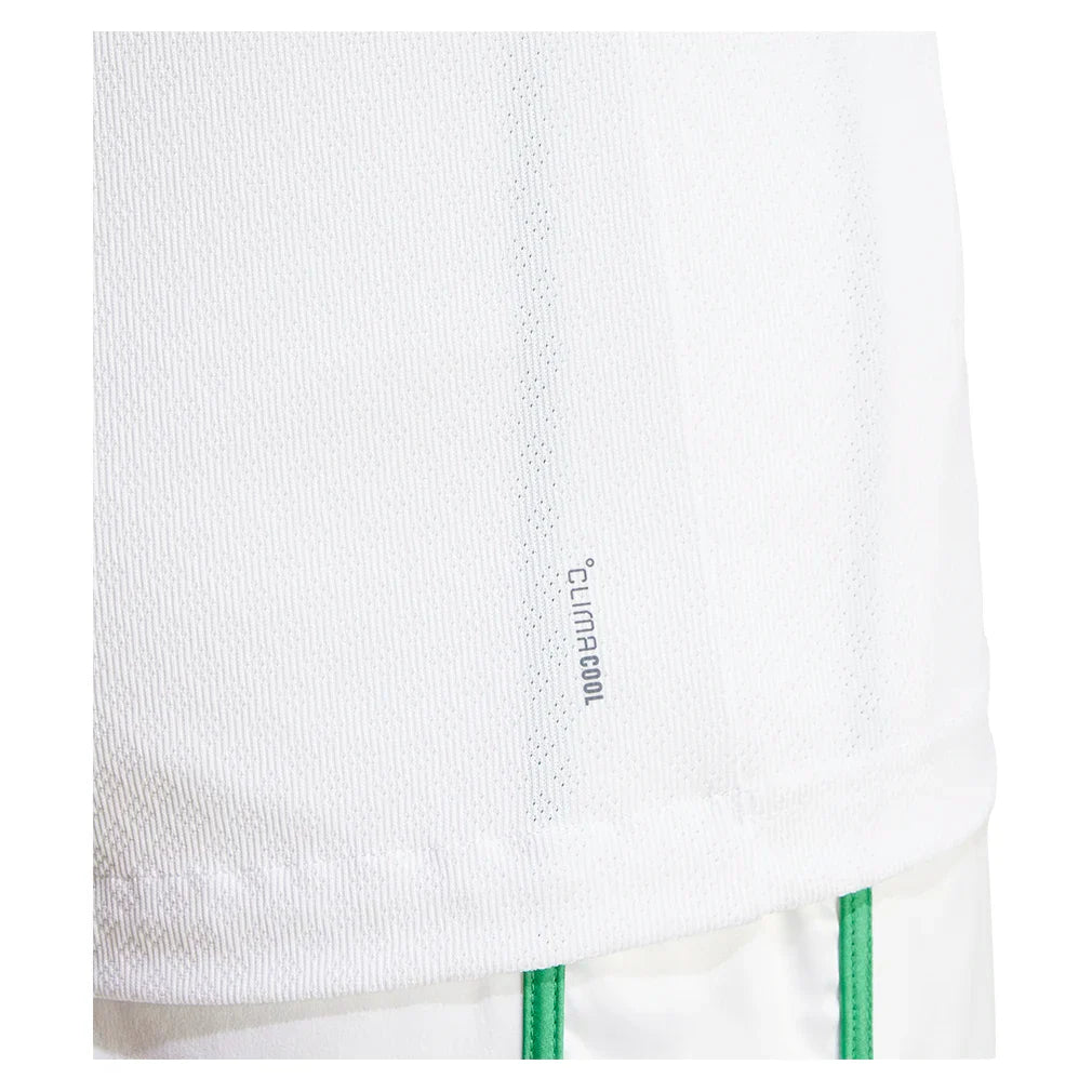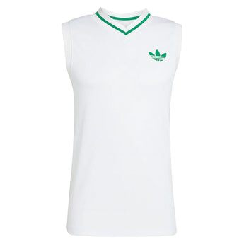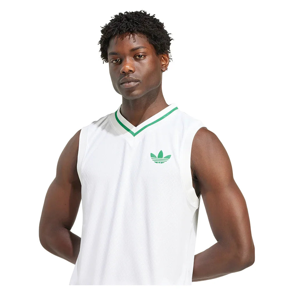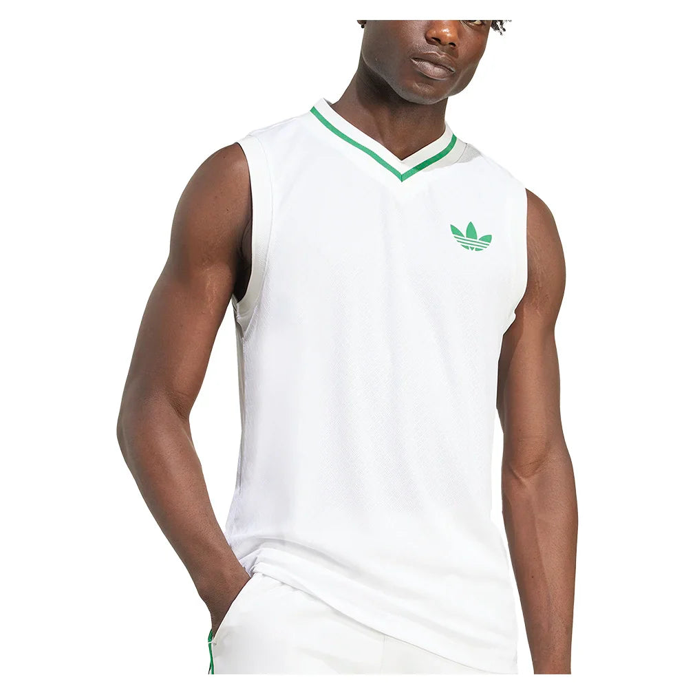 Gear up for grass court action with the adidas Men's Pro Court Tank Top. Designed with a v-neck collar with contrasting green trims, this athletic top exemplifies Wimbledon tradition by merging the traditions of both Court whites and lawn court play. The classic trefoil logo makes its triumphant return to show adidas' strong sporting legacy.