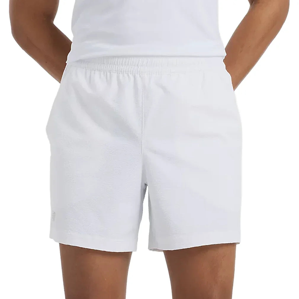 Dominate the court with the New Balance Men's Tournament Seersucker Court Short, where classic texture meets championship-level functionality. These performance shorts feature signature sculpted pockets designed specifically for easy Court ball storage and retrieval between points, keeping your rhythm uninterrupted. The internal drawcord provides secure fit while side slits enhance mobility for those explosive court movements and quick direction changes. Crafted from 4-way stretch seersucker woven fabric with sustainable materials, these shorts deliver the flexibility and eco-conscious performance that serious players demand.