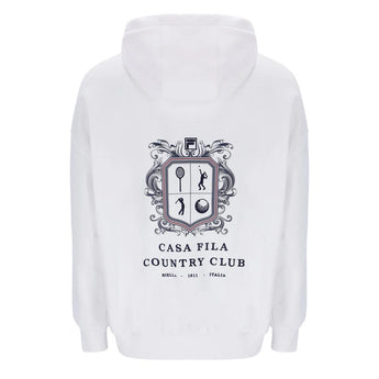 Join Casa Fila with the Fila Mens Country Club Crest Court Hoodie. The main feature is the back graphic, which depicts a coat of arms celebrating Fila's Court heritage. Belong its stylish look, this pull-over sweater is designed with a self-lined 3-piece hood which has a natural fit over your head. The front kangaroo pocket helps you put away any small items while you're on the go. For the finishing touches, a box logo on the chest brings together the look with strong brand recognition.