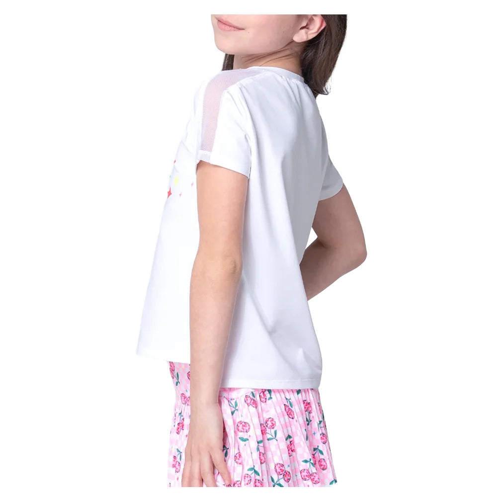 The Lucky in Love Girls' Disco Cherry Short Sleeve Court Top brings fun style to the court. This top features a classic crew neckline with short sleeves for comfortable coverage. Mesh detailing on the shoulders increases airflow during active play. Sporty side slits provide mobility and add an athletic touch. The high-low hemline gives extra coverage in the back while maintaining a contemporary look. The relaxed fit allows young players to move freely through every serve and volley.