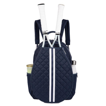 Fall in love with the Trelle and Co. Darling Court Backpack. This bag is made from lightweight yet sturdy nylon that's resistant to water, tearing, and fading. Fit up to 2 standard-sized racquets in the padded front zippered sleeve designed with contrasting ivory-colored stripes. Its spacious main compartment comes with interior pockets for easy organization, and the back compartment can fit a 15-inch laptop. Two side pockets give the perfect space to store water bottles and Court ball cans. The adjustable shoulder straps make the bag easy to carry, plus the built-in trolley sleeve fits around your suitcase for convenient travel.