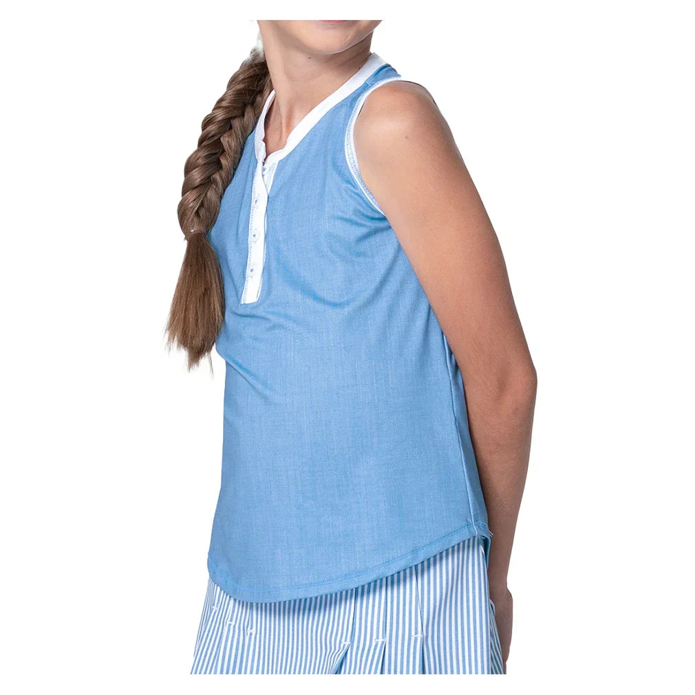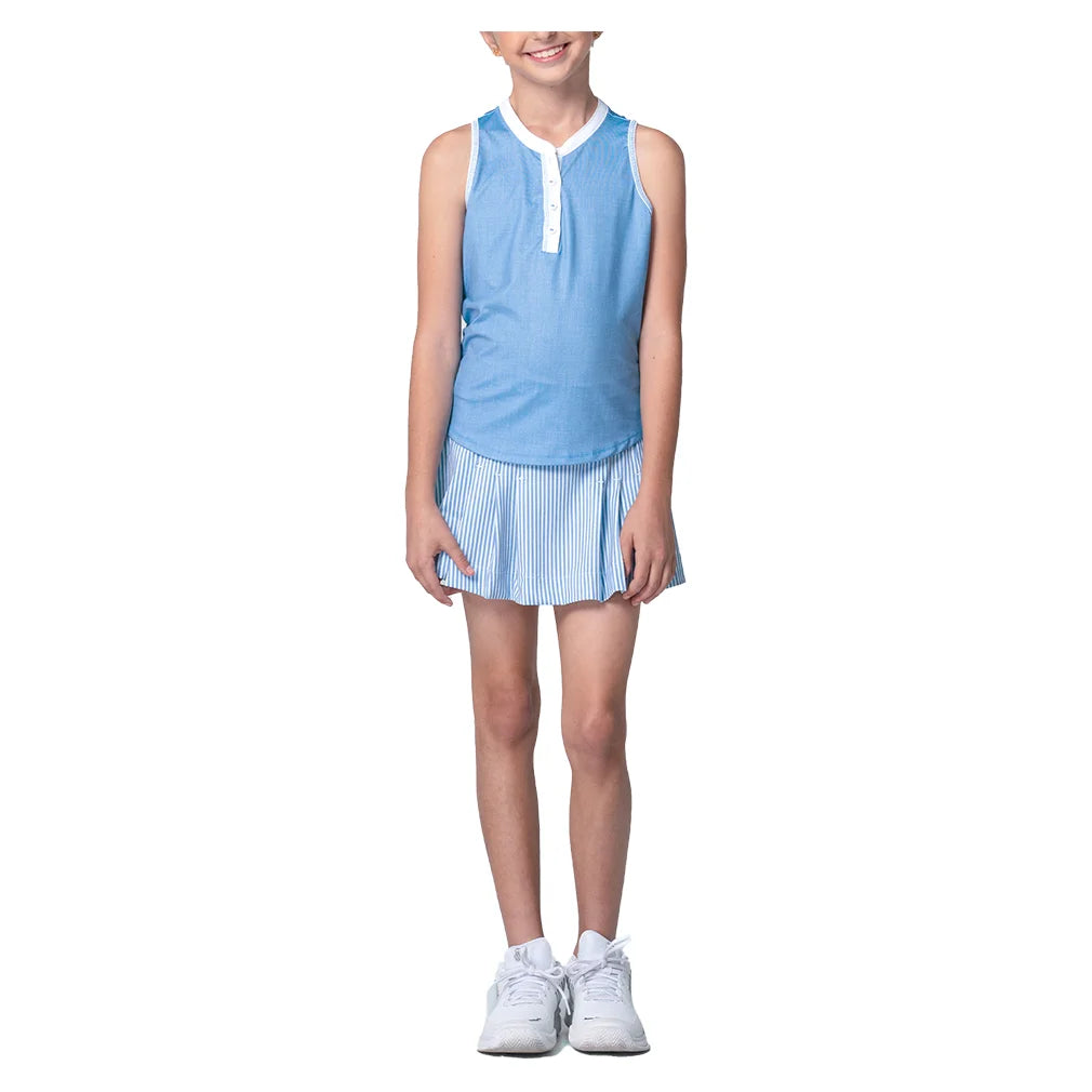 The Lucky In Love Girls' Linen Play Henley Court Tank features a contrasting 3-button placket that adds sporty style to this classic Henley design. A high neckline provides appropriate coverage for young players, while the full back construction offers security during active movement. The rounded hemline creates a flattering silhouette that stays in place during play. Breathable fabric keeps ju...