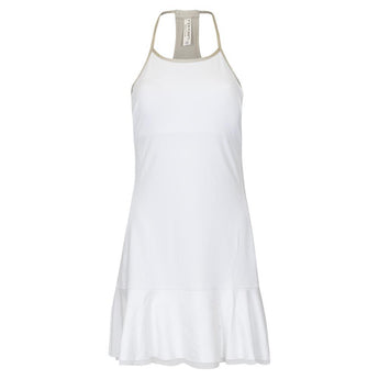 Complete your tennis fashion with the Inphorm Women`s Devon Tennis Dress. This performance tennis skirt will make you stand out on the court. With two pockets and a built-in shortie liner, you'll feel comfortable and supported as you play. Its moisture-wicking technology helps sweat dry faster and its open back allows for enhanced breathability. While the dress is white, the back straps are sand-colored, adding a pop of color. UPF 3+ fabric will help shield your skin from harmful UV rays and a little bit of flounce at the bottom of the skirt gives it a bit more flair.