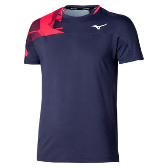 Experience performance and comfort with the Mizuno Men`s Shadow Tennis Top. Its crew neck design features Dynamotion flexibility to provide a comfortable fit with a wide range of movement. Moisture-wicking Aeroflow technology on the back panel improves airflow for cooling relief on the tennis court. The stark, asymmetrical pattern on the right shoulder creates a striking design fit for the mode...