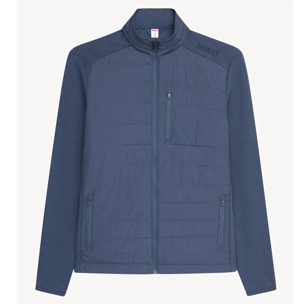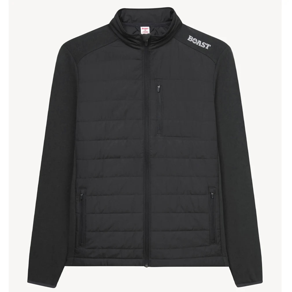 Keep warm this season with the BOAST Men's Hybrid Jacket 2.0. This quilted full-zip jacket features a higher neck piece for maximum coverage and is made from water-resistant fabrics for maximum protection against the elements. A multitude of zipped pockets gives you plenty of space to secure personal objects, and the chest pocket is even designed with a storm flap for extra security.
