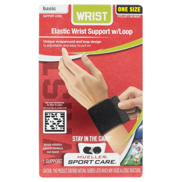 Give your wrist some relief with the Mueller Black Wrist Support. The elastic loop makes for easy on/off ability and the wraparound strap provides adjustable compression for easy pain relief. One size fits most players ranging from 6-12 inches (15-30 cm).