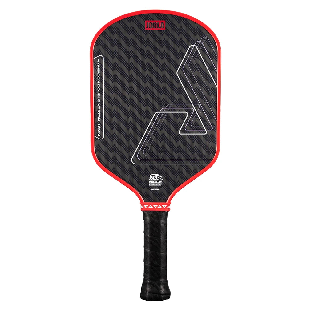 The Joola Hyperion Double Vision 16mm Pickleball Paddle is perfect for aggressive hitters, with its elongated length and tapered edge allowing players to hit fast and hard. Its textured, aramid surface enables spin generation to make winning shots even trickier to handle. A thermoformed edge wall at the neck provides extra stability and flexibility, while a special layer of SK Film between the core and hitting surface improves the sweet spot for more generous control.